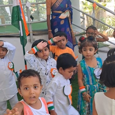 Dressed in colorful ethnic attire, the children joyfully participate in activities such as creating painting, singing patriotic songs, and listening to stories that highlight the significance of Indian independence. These experiences not only enrich their understanding of cultural heritage but also foster creativity, community spirit, and a sense of belonging.
